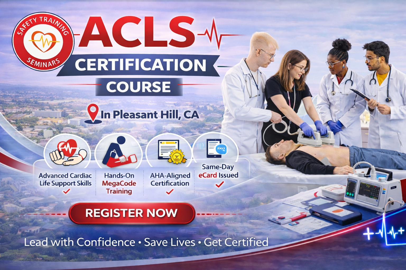 Safety Training Seminars provides the American Heart Association® (AHA) ACLS Certification Class in Pleasant Hill, California, offering advanced life-support training for healthcare professionals across Contra Costa County and the surrounding East Bay region. Pleasant Hill is conveniently located near Walnut Creek, Concord, Martinez, Lafayette, and Clayton, making it an accessible location for medical providers seeking Advanced Cardiovascular Life Support training.